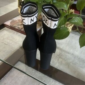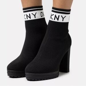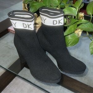 DKNY Women's Black Tessa Knitted Monogram Ship on Platform Heel Ankle Boots
