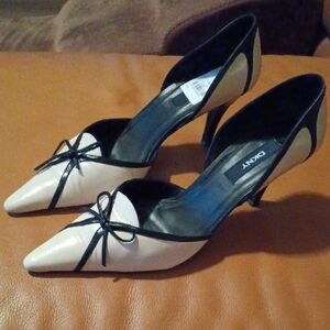 Step out in style with these elegant DKNY heels. Featuring a chic black and cream design, these shoes are perfect for any occasion. The sleek silhouette and sophisticated color combination make them a must-have addition to your wardrobe.