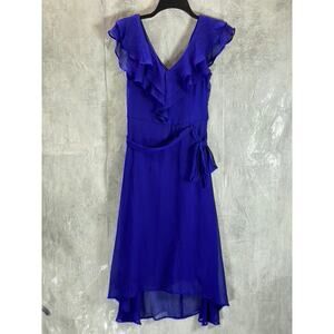 DKNY Women's Blue Ruffle Belted V-Neck Mesh Short-Sleeve Midi Dress SZ 2