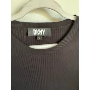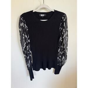 Elevate your wardrobe with this stylish DKNY women's sweater. Featuring elegant chiffon sleeves and a flattering V-neck, this ribbed black sweater in size medium is adorned with a delicate floral pattern.