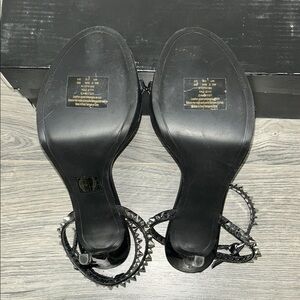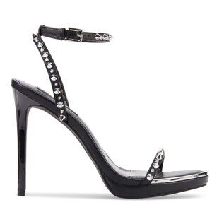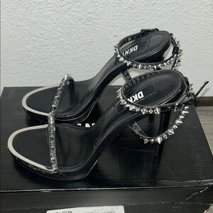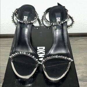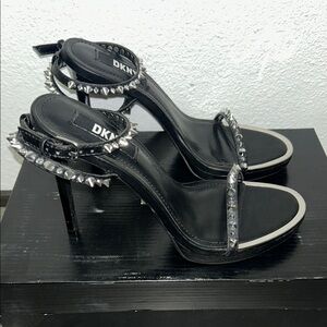 Multifaced studs add metallic flash to a sleek stiletto lift in the gorgeous Dacia ankle-strap sandals from DKNY.