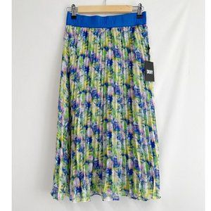 NWT DKNY Womens Floral Printed Pull On Midi Pleated Skirt Logo Waist Band Blue size S. MSRP 109