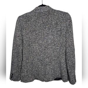 Elevate your wardrobe with this stylish gray and white blazer from DKNY with blue and yellow speckles. Perfect for any occasion, this jacket offers a sophisticated look with its classic design. Vintage. Shoulder pads have been removed.