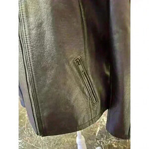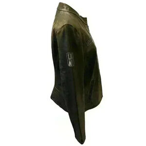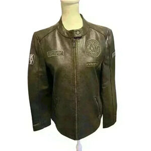DKNY Women's Large Genuine Leather Biker Jacket Black with Patches Full Zipper