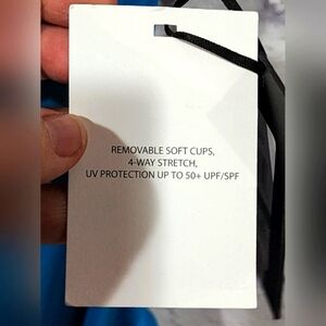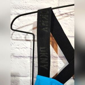 This DKNY swimsuit is a sporty, bold one-piece in a vibrant turquoise blue color. It has a high scoop neckline and a sleek, open-back design with black, wide elastic straps that crisscross across the back. The straps are branded with the DKNY logo, adding an athletic and urban touch to the look. This swimsuit combines a striking color with a minimalist, athletic aesthetic, making it ideal for those who want a modern and functional design with a stylish edge. The open back and wide straps provide a secure fit and make it suitable for active beach or pool days.