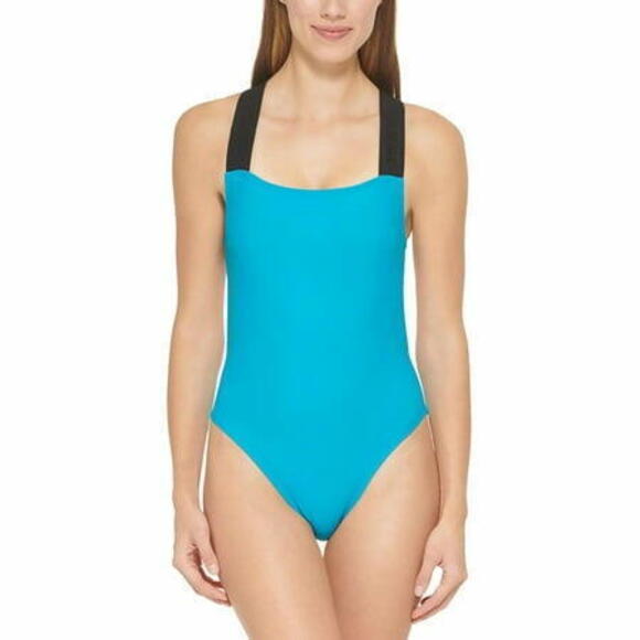 DKNY Women's Logo Cross-Back One-Piece Swimsuit Blue L