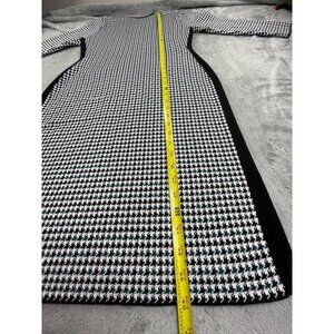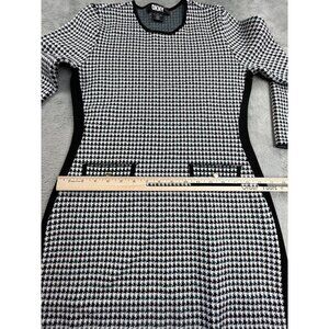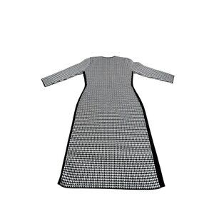 This DKNY midi dress features a classic houndstooth pattern with contrasting side panels for a flattering silhouette. It has long sleeves and two front Faux pockets. The versatile design makes it suitable for various settings, offering both comfort and style for day-to-night wear.