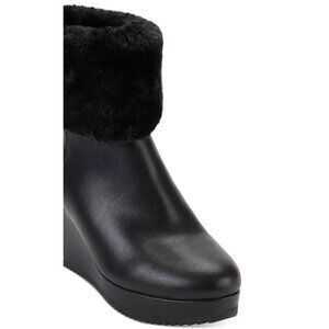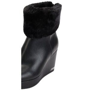 Fluffy faux-fur collars add cold-weather appeal to a sleek wedge lift in the versatile Nadra booties from DKNY.