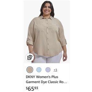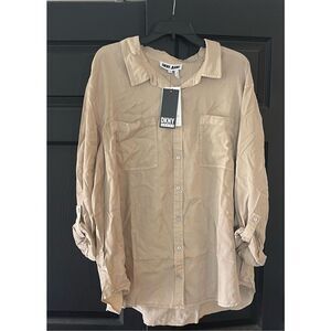 DKNY Women's Plus Garment Dye Classic Roll Tab Sleeve Button Front Shirt