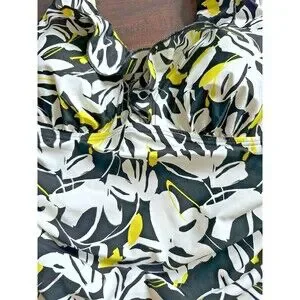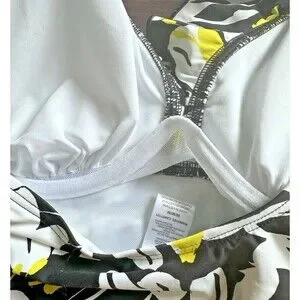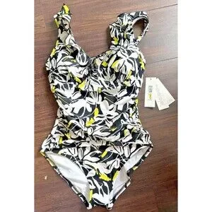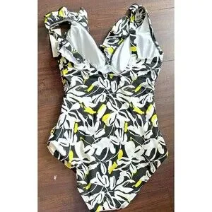 DKNY Women's Ruffle Neck One-Piece Swimsuit Fluorescent Yellow Black & White XL