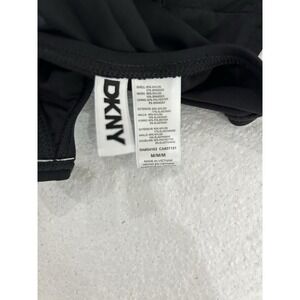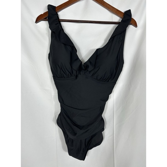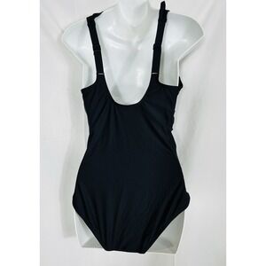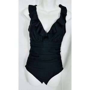 DKNY Womens Ruffle Plunge V-Neck One Piece Swimsuit Solid Black Size M NWT