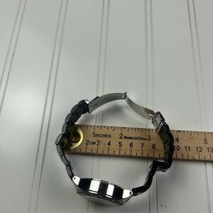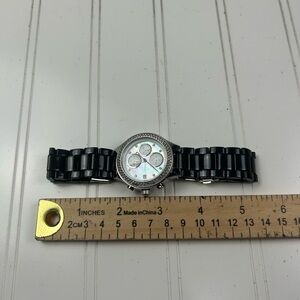 Stylish DKNY watch with a silver dial. Black strap and crystal accents. Perfect for any occasion.