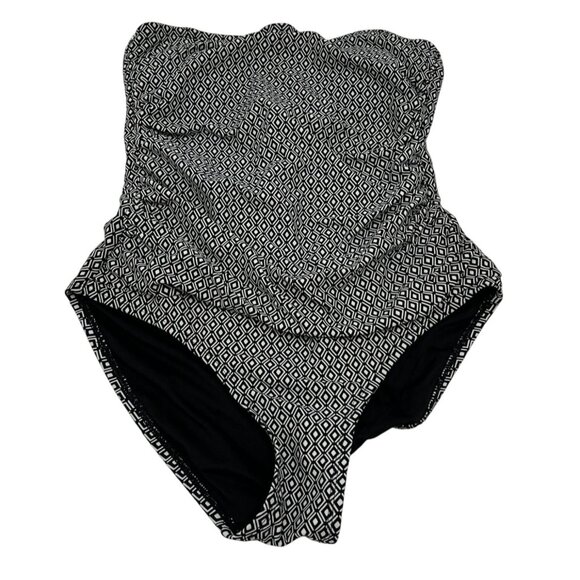 DKNY Womens Strapless One Piece Swimsuit Medium Black Geo Ruched Side Swimwear
