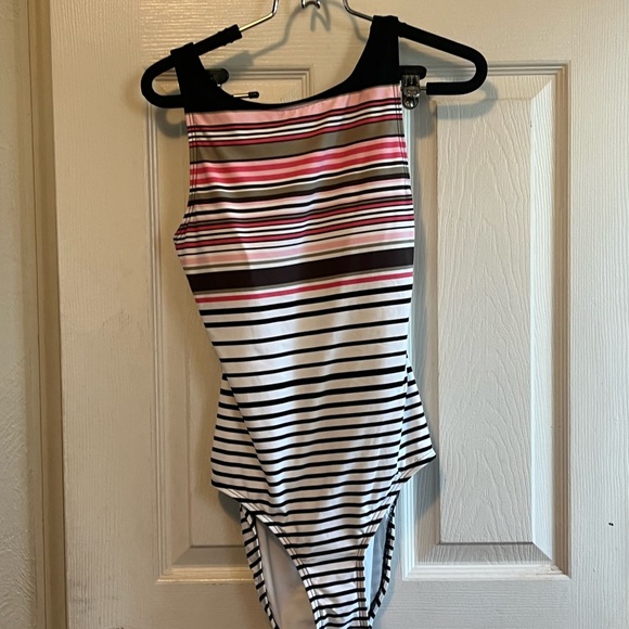 Chic one piece with bold stripes. Features black, pink, and white colors. Ideal for beach or pool.