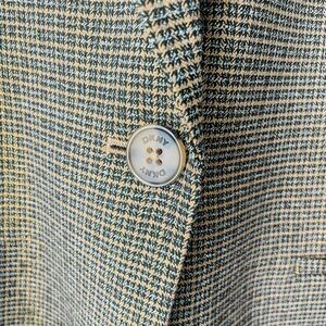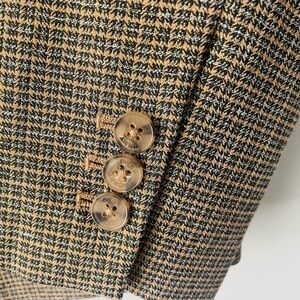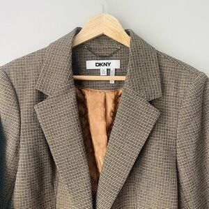 Gorgeous plaid blazer by DKNY. Fully-lined on the inside. In excellent condition size 14P. Specks of gold with tan & gray.