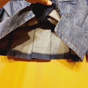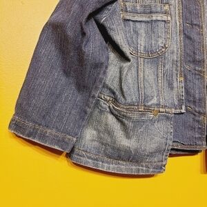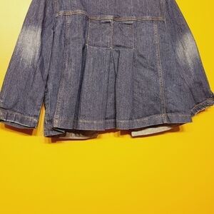 Women's vintage, full zipped, cropped denim jacket by DKNY Jeans, size large. Four pockets and hidden button closures. Fabric: 98% cotton and 2% spandex. Slight pleating in the back. Excellent pre-owned vintage condition overall; some distress and wear as designed.