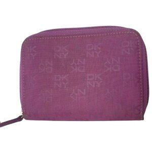 DKNY wallet, purple wallet, compact wallet, women's wallet, zip-around wallet, ID window wallet, card holder, small wallet, designer wallet, DKNY accessory, travel wallet, purple accessory, canvas wallet, branded wallet