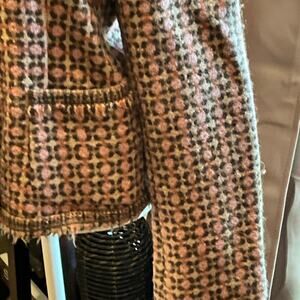 DKNY Wool Brown Button Jacket NWOT Brown/Cream/Pink Size 12. Fringe around the arms and base of jacket. $ 695 New