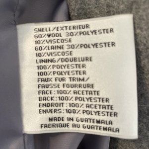 Wool/Polyester coat side zipper with faux fur collar and cuffs.