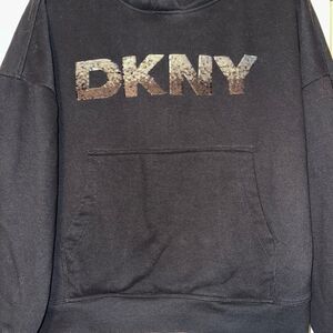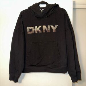 DKNY XL Women’s Sequin Logo Hooded Long Sleeve Pullover Sweatshirt EUC