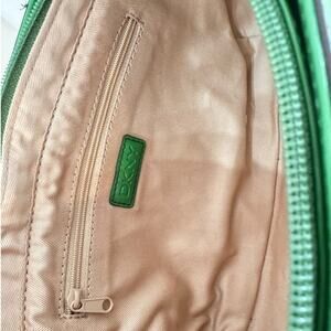 Channel retro vibes with this DKNY Y2K green leather shoulder bag, featuring a sleek baguette silhouette, silver-tone hardware, and a zip-top closure. A bold yet timeless accessory perfect for adding a pop of color to any outfit.
