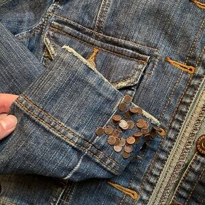 Add true Y2K edge to your wardrobe with this DKNY vintage distressed denim jacket, featuring bold bronze disc accents for a unique designer touch. Crafted in classic blue denim with a worn-in look, this jacket brings together 2000s streetwear vibes with timeless DKNY style.