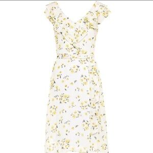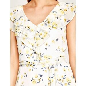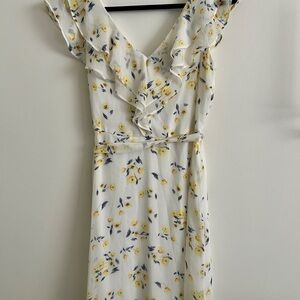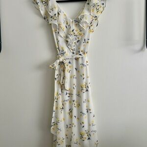 Chic high low dress with yellow floral design. Features ruffle sleeves and a tie waist. Ideal for stylish outings. Excellent used condition from a smoke-free home.