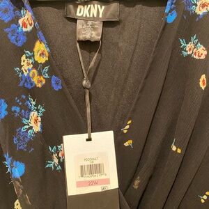 This DKNY sundress showcases a vibrant floral design in yellow and blue, set against a dark backdrop. The dress features elegant long bishop sleeves and a classic crew neck, making it ideal for wedding guest or cocktail events.