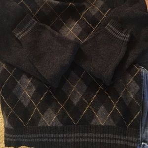 DKNY collegiate argyle grey wool sweater. 2 light get stripes on sleeve and at bottom. Plaid colors are dark grey, light grey, black and gold.