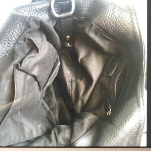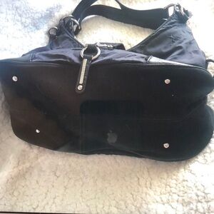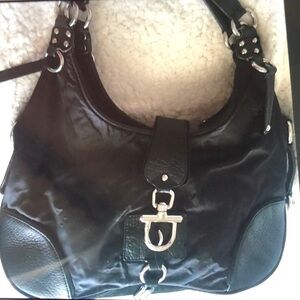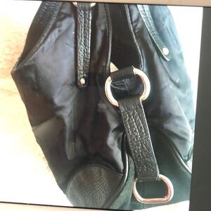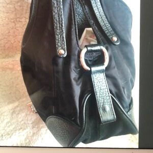Beautiful DKNY nylon and suede and leather bag with silver hardware shows on my small signs of use as one inside the pocket to inside slip pockets measurements are 15”across 8”deep 7”wide with protective Rounded bottom with key holder on both sides