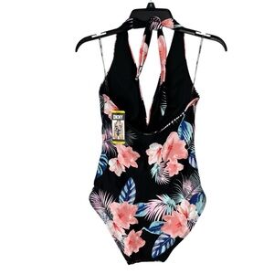 New with tags, DKNY halter one-piece swimsuit in a black and pink tropical print, size medium. Features a flattering halter neckline, tummy-control, and removable cups for customizable support. Stylish and comfortable with a sleek silhouette—perfect for beach days, vacations, or poolside lounging.