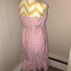 Very cute and summary DKNY casual dress. Light cotton, comfy🌸 buttons down, has long ruffle hem, 2 front faux pockets sz. 11 light pink & blue stripes🦋- bust measures 15” across and from under arm & down is 28” NWOT