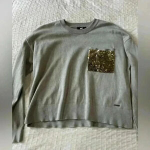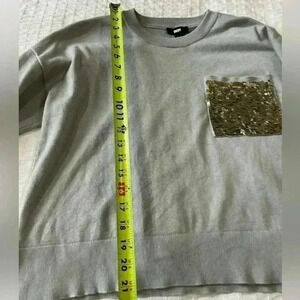 This sweater is so cute! It has an oversized fit, size medium. It's light weight, with no defects. The pocket features light metallic gold sequins.