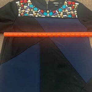 neckline is adorned with bold, colorful embellishments, including geometric shapes and stones in bright shades of red, blue, gold, purple and black