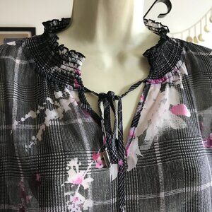 DKNY size XL Sheer Black Glen Plaid Chiffon Pink Floral & Lace Blouse Top