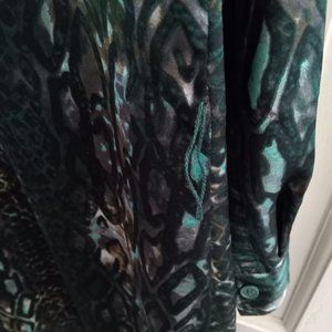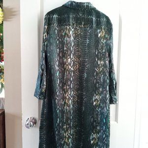 EUC, 3/4 sleeves, has a belt and you can see the loops in the close-up photo, the sleeves can be rolled up and secured. FYI, I used to be 5'3 105 lbs and it fit well. Rich deep colours. Can be dressed up for any occasion. Price firm and thanks so much for looking!