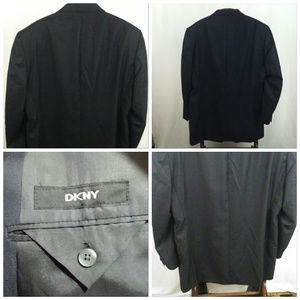 DKNY men's sport coat jacket. Size 44L. Black. Chest 48" (122 cm), back length 33" (84 cm). 92% wool, 8% cashmere. 3-button. Notched lapels. Location 1463-H-PEX. Non-smoking cat-friendly home.