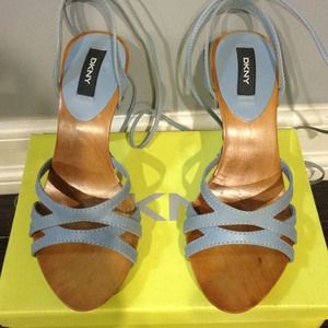 Wooden heel and platform sandals from DKNY. Perfect for a day to night out wear! Heel is 3 3/4" high with 3/4" platform