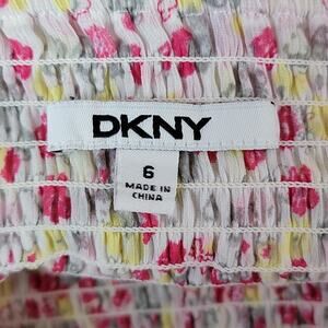 Small floral pattern on this chiffon tiered sundress by DKNY. Fully lined with some runs in the fabric that are noticeable under a scrutinizing eye. Lining has some stains and one of the straps is in need of mending. Pre-owned and still in wonderful condition. In girls size 6.