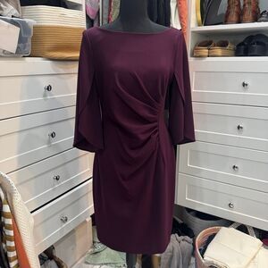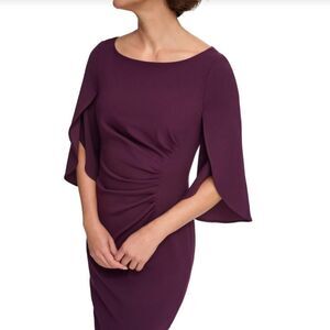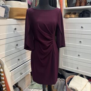This DKNY dress in a striking wine colored hue features a form-fitting sheath style, perfect for cocktail events. The bateau neckline and 3/4 dolman sleeves add a touch of elegance, while the subtle waist detail enhances its flattering silhouette.
