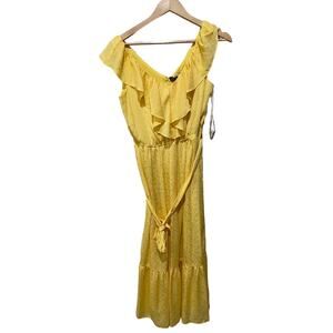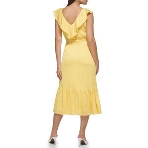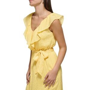 Presenting the ultimate workwear dress by DKNY. This maxi-length, yellow dress is characterized by its ruffle and V-neck style. Designed for the modern woman, it features a sleeveless cut, perfect for the office or professional events.