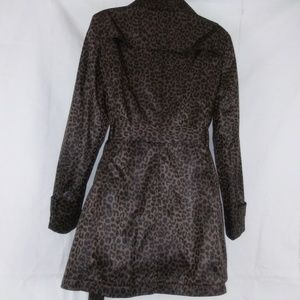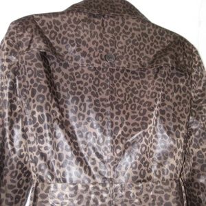 NWOT leopard print lightweight raincoat, dark/shiny tan brown color combo, fully lined trench coat. Double breasted with buttons for closures & detail, long sleeves with half band & waist belt. Sewed fabric like a yoke on back shoulder, inverted back box pleats from thighline to hemline. Side slash pockets with flap in front & above knee-length.
