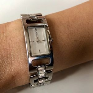 A gorgeous DKNY watch with a rectangular face and steel link strap with crystals.