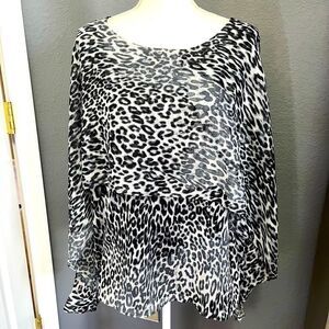 Sheer elegance from DKNY. This animal-print blouse features a cape-like overlay for a graceful and unique look. Metallic silver thread accent. Lined. Elastic Smocked Cuffs. Open inner sleeve.