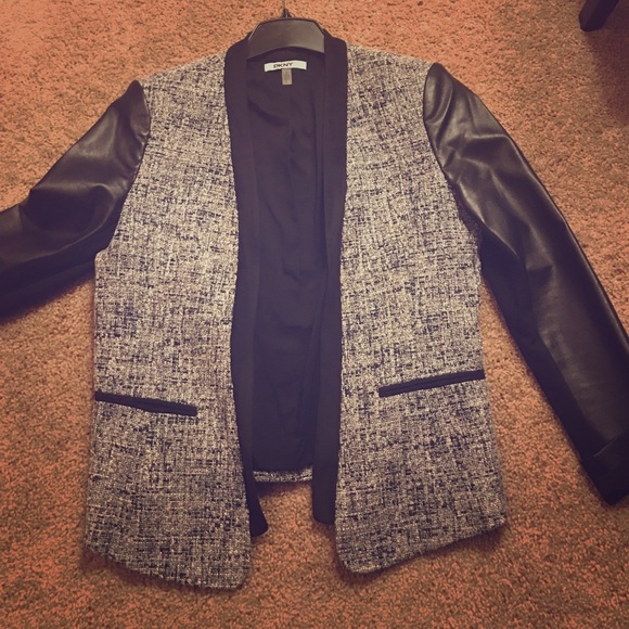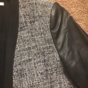 Faux leather sleeves, faux suede collar blue and black print blazer