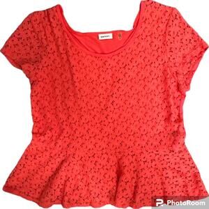 Add a splash of sophistication to your wardrobe with this eye-catching DKNYC two-piece blouse in size XL. The set includes a vibrant lace overlay top and a coordinating cami, providing both style and comfort. The blouse's intricate lace pattern and flared hem deliver a touch of elegance, perfect for dressing up or down. The matching camisole ensures coverage and versatility.