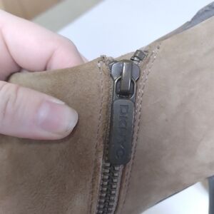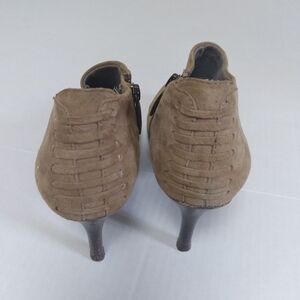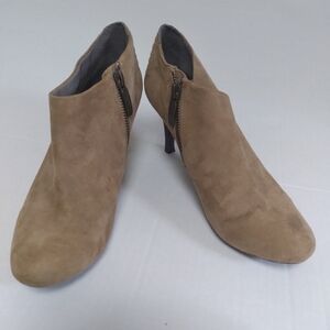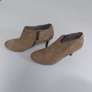 DKNYC heeled suede ankle bootie with side zipper detail and stiletto heel.