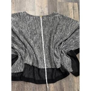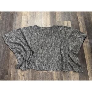 A stylish knit poncho featuring a marled gray pattern with black trim. Perfect for layering. It is a size M/L and is in excellent used condition.
