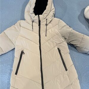 Chic light beige puffer with quilted design. Features zip closure and cozy interior. Ideal for cold weather.