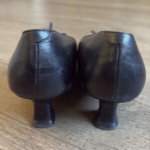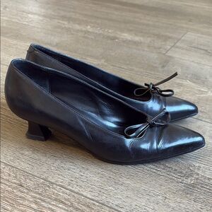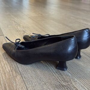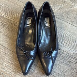 DKNY Donna Karan New York Black Leather Pointed Toe Kitten Heels w Bow Details